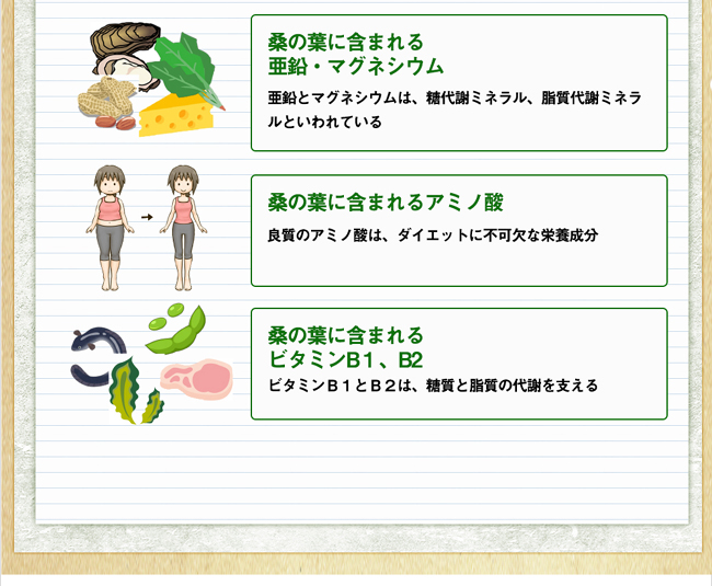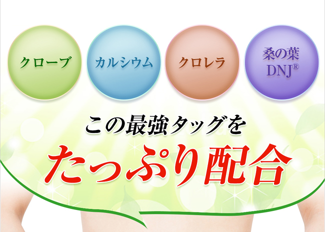 | 原材料 | 桑葉末(国内製造)、食物繊維、クロレラ末、クローブエキス、化石サンゴ末(与那国産)、ナタネ硬化油脂末、桑葉エキス、精製セラック |